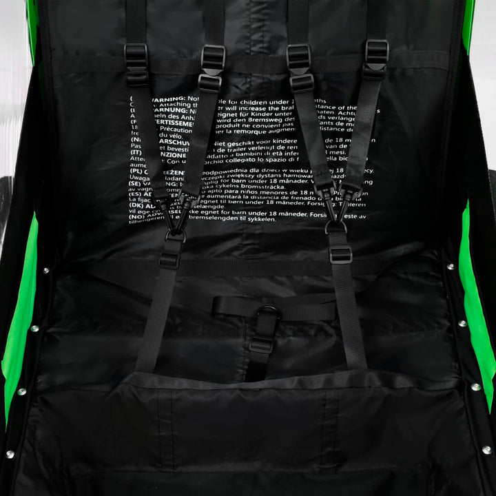 This practical bike trailer can be easily converted into a stroller in seconds and presents a great way to take the children out for a ride or walk. It is suitable for 1 to 2 children with a combined maximum weight of 40 kg. This kids' bicycle trailer has a sturdy steel frame and is made of oxford fabric, which makes it water resistant, durable and easy to maintain. The all-weather canopy and mesh screen protect your kids from rain or sunshine, while two transparent side windows provide a great view of the road. Its 5-point safety harness system offers optimal security for your kids. The kids' bike trailer features high-visibility colouring and wheel reflectors for maximum visibility and a handbrake on the front wheel for added safety when going down hills. Two inner pockets provide ample storage space for food, toys and other necessities. Its safety rotating joint ensures that the trailer will remain upright if the bicycle falls over. This children's bicycle trailer has a quick-release hitch for easy attachment to a bike. This bike trailer can also be folded for easy storage and transport. A safety flag is also included in delivery for added visibility. Assembly is easy.