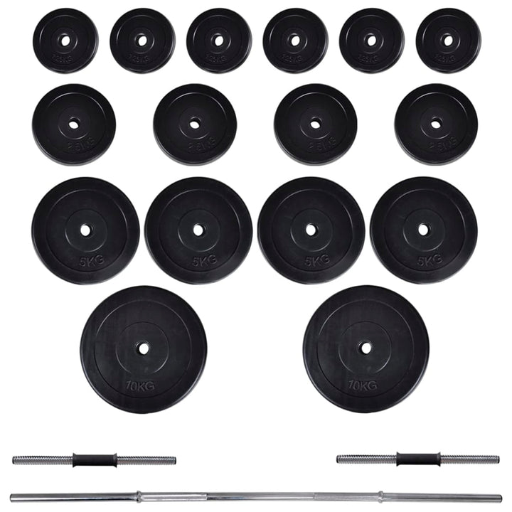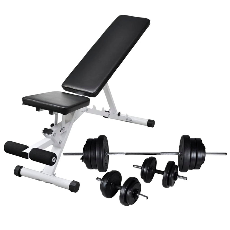 This workout bench, delivered with a barbell and dumbbell set, will improve your physical fitness, tone your muscles and, in conjunction with a calorie-controlled diet, help you lose weight. It is suitable for your personal home gym or any commercial gym or training studio. The weight bench is equipped with an adjustable backrest. The backrest will comfortably support your back and shoulders during your workout. The five adjustable settings of backrest enable you to choose the most comfortable position and adjust your training intensity to meet your specific needs. This versatile fitness bench is constructed from top-quality steel, and the durable, padded cushion will offer you great comfort during your workout. The barbell and dumbbell set features solid chrome-plated bars with quick-action spring collars (for barbell bar), non-slip knurled grips, and fluted star-screw caps (for dumbbell bars) for secure attachment of the weight plates. You can work out without worrying about safety issues. The weight plates are made with a robust polyethylene casing. They can be combined in various ways for different training purposes. Delivery includes a workout bench, a barbell bar, two dumbbell bars, six 1.25 kg weight plates, four 2.5 kg weight plates, four 5 kg weight plates, two 10 kg weight plates, four caps and two spring collars.