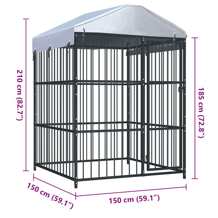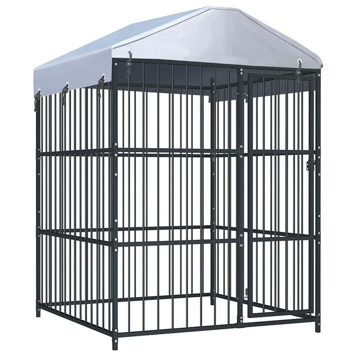 Our outdoor heavy-duty dog kennel is versatile. Your dogs can play, exercise, get trained, or simply stay safe. It is a perfect play paradise for your furry friends! This large dog kennel provides ample exercise space while the steel bar walls help prevent mischief and unexpected accidents while enabling ventilation. Thanks to the sturdy and heavy-duty steel construction, this dog kennel is durable and built to last. The included fire-resistant and UV protected roof is made of 100% polyethylene and protects from the sun, rain, snow, and other harsh weather conditions. The hinged door has a lockable latch system which ensures extra security and safety for your dogs. Our dog kennel is easy to assemble. Good to know:To prevent damage from heavy snow buildup, we recommend clearing the roof regularly during winter.