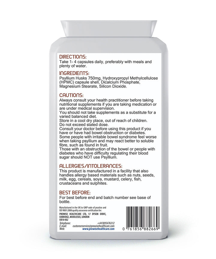 Psyllium Husks 750mg x 90 Capsules by Prowise Healthcare Description: - OVERVIEW: - Psyllium Husks 750mg capsules are a convenient daily health supplement providing an outstanding source of dietary fibre. - Popular among individuals following low-carb diets. - Prowise Psyllium Husks capsules help remove toxins by absorbing water and waste materials in the bowels. - Works well when taken alongside Probiotic Max. - Manufactured in the UK under GMP code of practice for guaranteed quality and safety. - Suitable for vegetarians and vegans. - KEY BENEFITS: - Maintains healthy bowels by increasing stool bulk and removing waste material. - Supports normal cholesterol and blood sugar levels. - Supports a healthy immune system. - May be used to support weight loss programs. - Supports normal healthy digestive function. - Suitable for vegetarians and vegans. - Manufactured in the UK to GMP code of practice, ensuring quality and safety. - ENJOY A HEALTHIER LIFE WITH OUR PSYLLIUM HUSKS CAPSULES