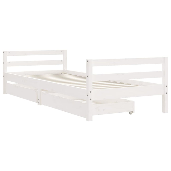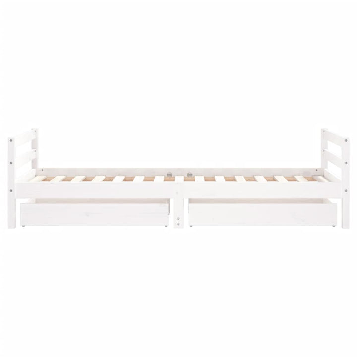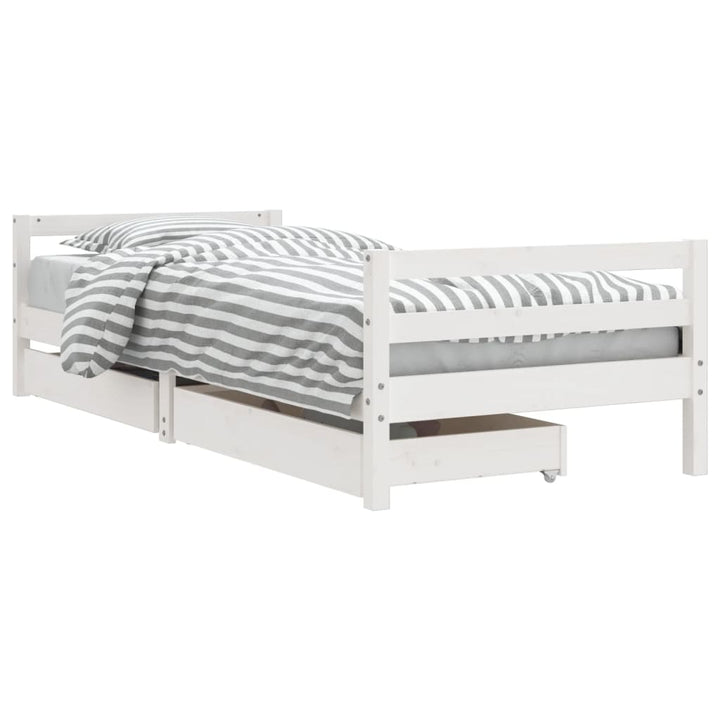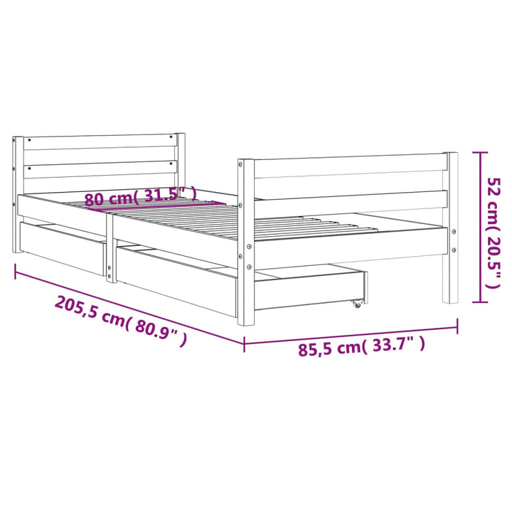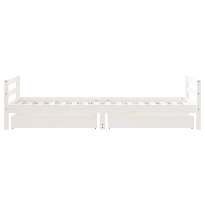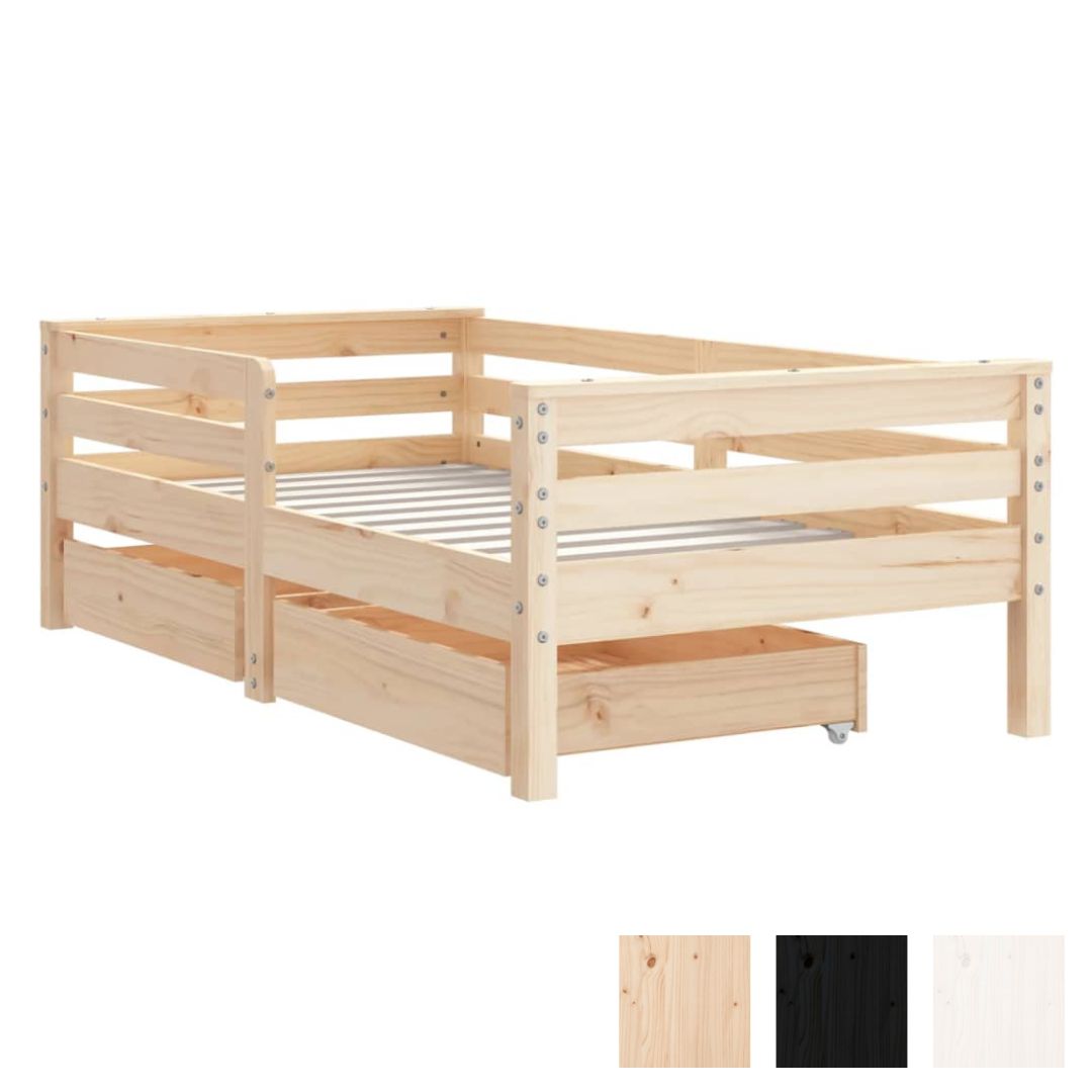 Dream a dream with this wooden kids bed frame. Featuring an elegant and timeless design, it is the perfect choice for your kids! Solid pine wood: The kids bed frame is made from solid pine wood. Solid pine wood is a beautiful natural material. Pine wood has a straight grain, and the knots give the material its signature, rustic look.Sturdy slats: The bed for kids has wooden slats for firm support, ventilation and stability.Storage drawer: The included storage drawers provide ample space for storing small toys, clothing and bedding, keeping the room tidy and clean.Functional headboard and footboard: The headboard and footboard of the toddler bed keep your mattress in place.Considerate design: The height of the kids single bed is designed to be low to the ground, making it easy for your child to get in and out of bed. Good to know:A mattress is not included with this bed. We do offer a various selection of mattresses. You can check our shop for a matching mattress.