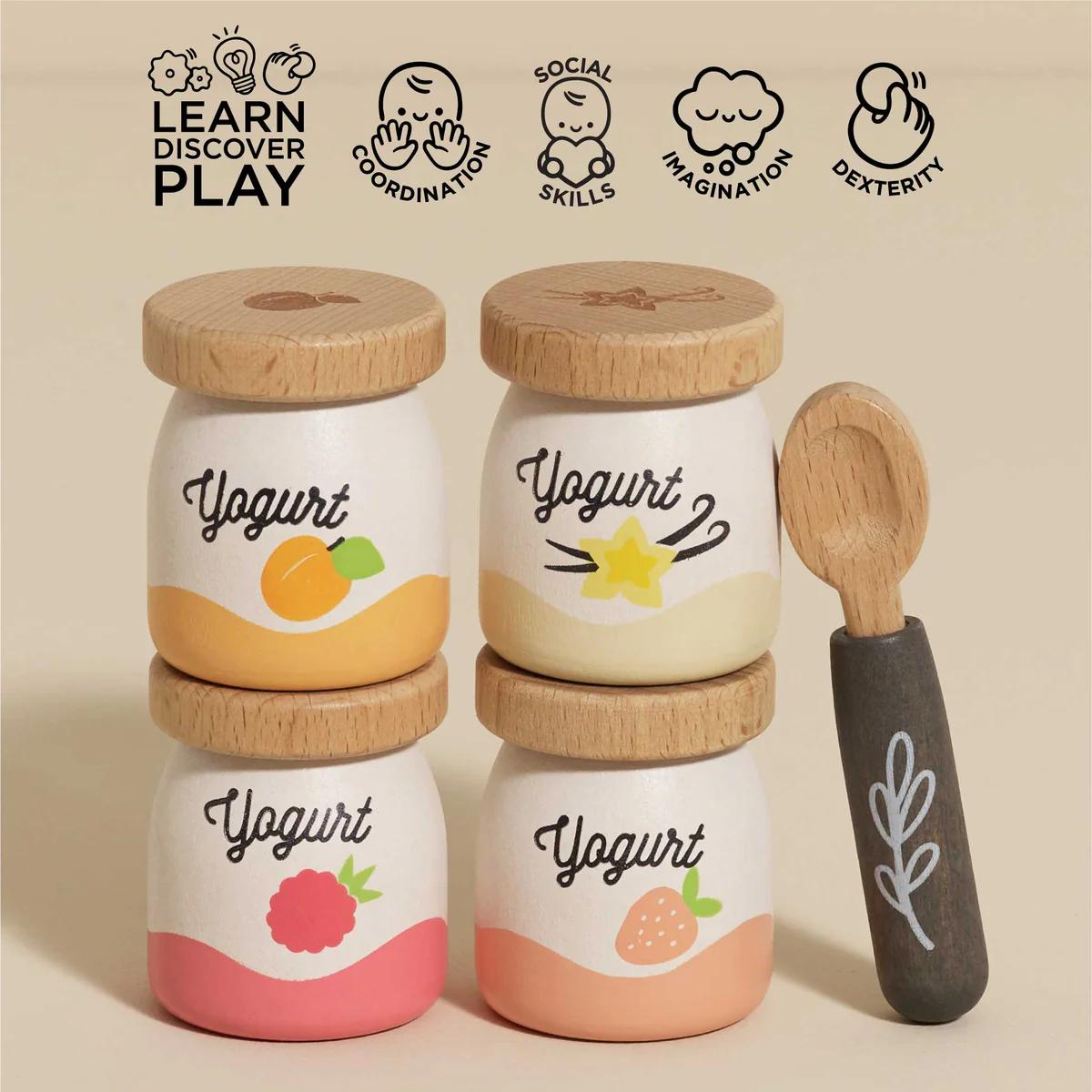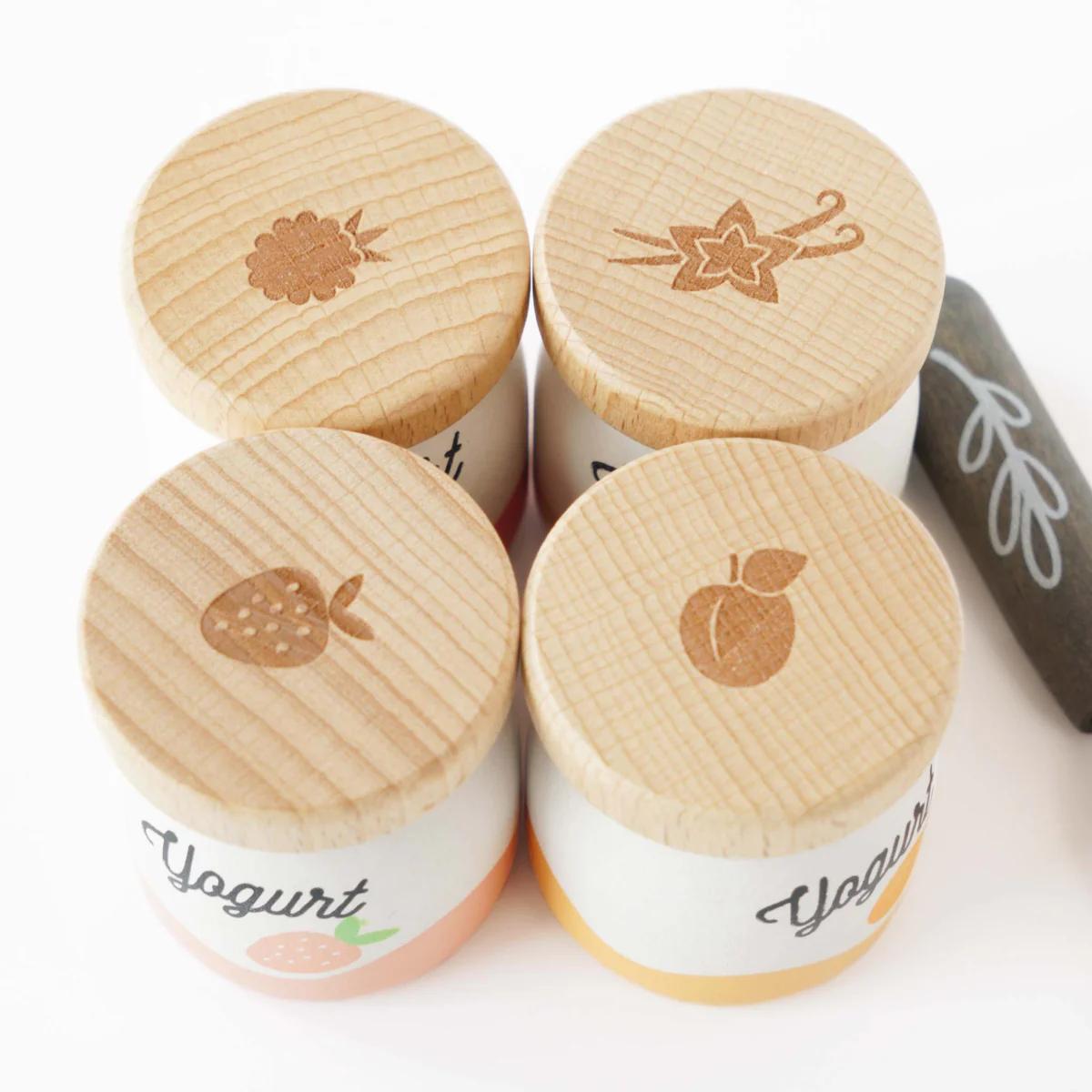 Add some flavour to your child's playtime with the Yogurt Play Food Pack! Featuring four pastel-colored flavor pots - apricot, vanilla, raspberry, and strawberry - with intricately engraved wooden lids. A deliciously realistic addition to any little one's pantry.
