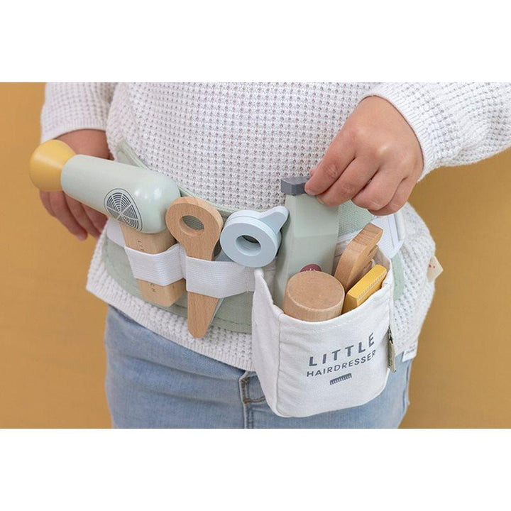 This wooden set of essentials for hairdressing, includes toy scissors, a blow dryer, a straightener, clippers, a comb, shampoo, hair spray and styling gel. Your little one will have so much fun playing this part.