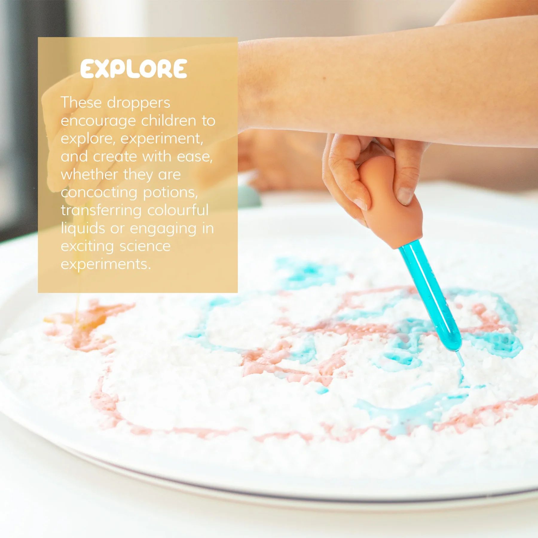 Each of the six droppers features a soft silicone bulb and a durable, transparent PC plastic tube, perfect for mixing colours, experimenting with liquids, or transferring water, sand, or mud.