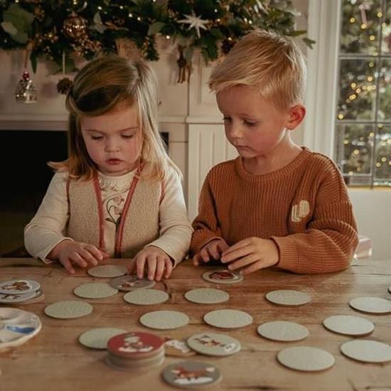 This easy-to-play memo game is both fun and educational. The round cards feature beautiful winter-themed illustrations, ranging from snowmen to reindeer. Thoroughly shuffle the cards and put them face down on the table.