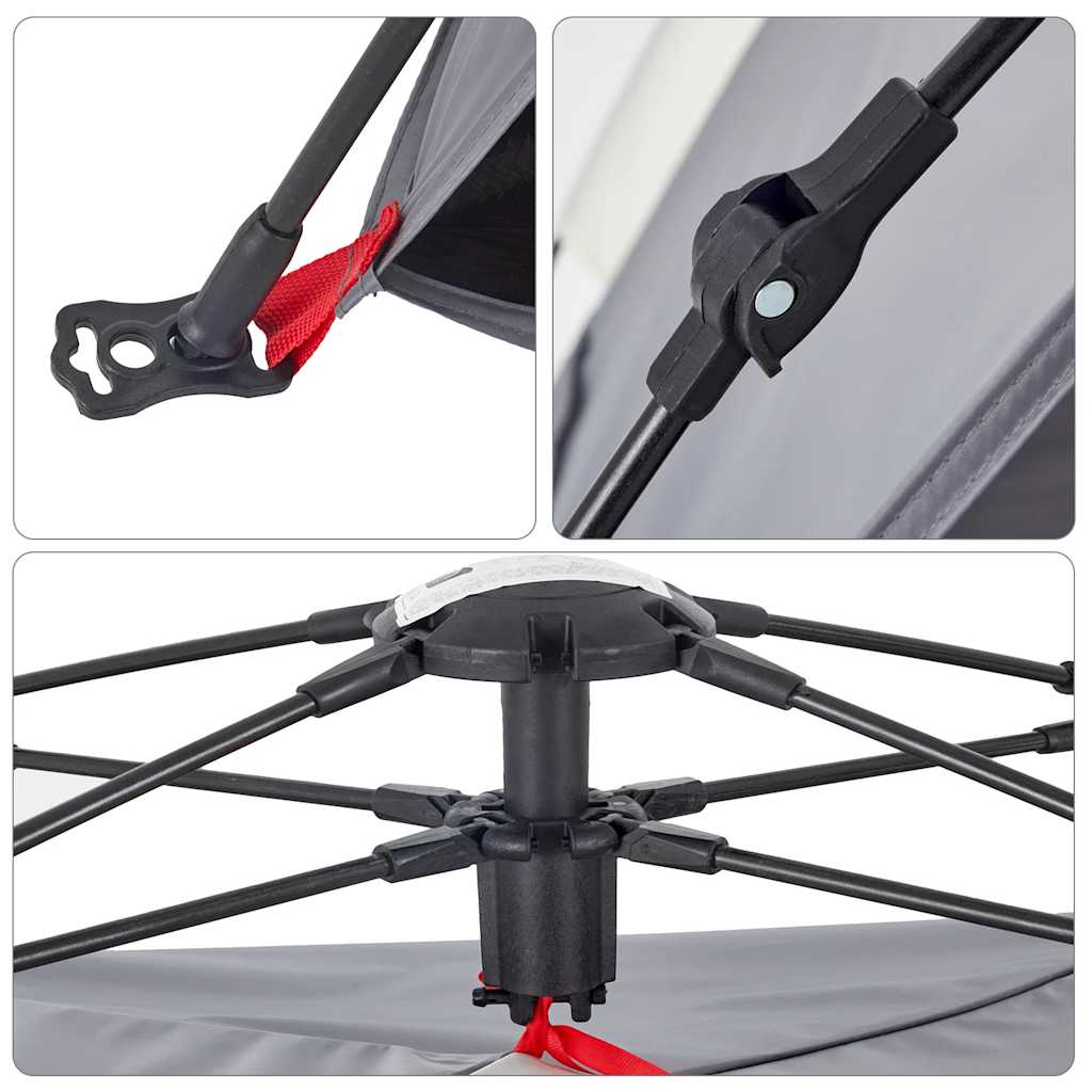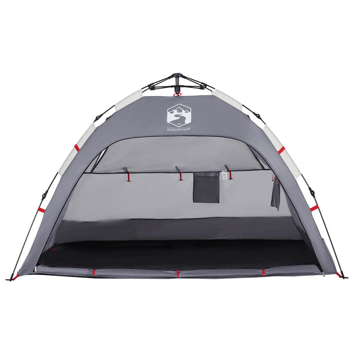 This beach tent offers you and your friends a cosy shelter in the hot summer or use it as a shade over the sandpit and paddling pool. Waterproof: This camping tent, made from polyester with a PU coating, is waterproof and wind resistant.Quick-release system: Set up the tent effortlessly with the quick-release system! Lay the tent down, extend the pre-assembled poles until they lock into place, and you're all set!Dual-window design: The mesh window provides great ventilation and keeps insects out, while the waterproof window offers protection from wind and rain.Easy access: The zippered door allows for easy access. You can roll it up and secure it with the door toggles. It also promotes airflow and provides ample natural light.Stable and safe: Secure your tent firmly to the ground with the stakes and guy ropes provided to ensure stability and safety. Warning:Keep all flame and heat sources away from this product fabric.