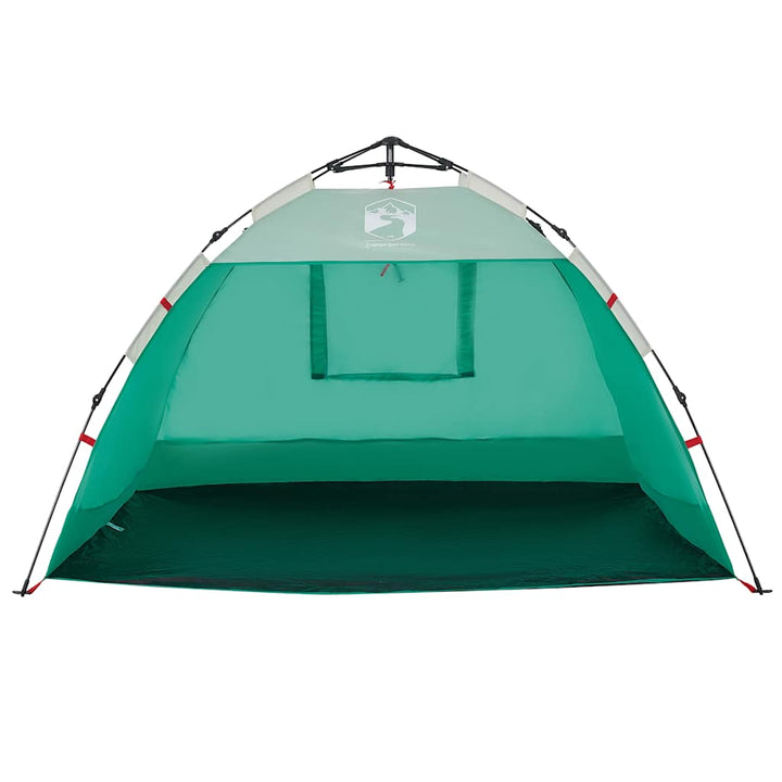 This beach tent offers you and your friends a cosy shelter in the hot summer or use it as a shade over the sandpit and paddling pool. Waterproof: This camping tent, made from polyester with a PU coating, is waterproof and wind resistant.Quick-release system: Set up the tent effortlessly with the quick-release system! Lay the tent down, extend the pre-assembled poles until they lock into place, and you're all set!Opened door: The fully open door allows you to enjoy the beautiful beach scenery with your family or entertain the children freely on a delightful summer afternoon.Lightweight and portable: The foldable and lightweight design allows you to easily pack the tent and store it in the included carry bag for easy transport.Stable and safe: Secure your tent firmly to the ground with the stakes and guy ropes provided to ensure stability and safety. Warning:Keep all flame and heat sources away from this product fabric.