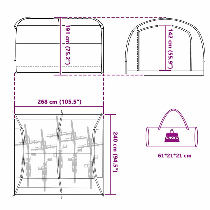 This compact bike tent is a must-have for any outdoor space. With its modern style, it mixes simplicity with functionality, fitting in nicely whether you’re in a house or a flat. Made just for outside use, this versatile tent has a sleek and minimal design, perfect for keen cyclists or anyone who needs dependable bike storage. It looks great with its clean lines, making it both a practical and stylish choice for your outdoor area. Whether you've got a big garden or a small yard, this tent neatly houses your bikes while adding some flair and practicality to your space, combining safety with good looks. Weather Resistant Structure Built to take on bad weather with top-notch resistance features. It’s a solid barrier against rain, wind, and harsh sun, keeping your bike safe year-round and making bike upkeep much easier. Waterproof Polyester Surface Made from high-quality waterproof polyester, it keeps your gear dry even when it rains. Perfect for wet and humid weather, your stuff stays safe from moisture damage, making it last longer for your adventures. Efficient Use of Space The compact design makes the most of storage while taking up little room in your garden, yard, or porch. It fits right in without fuss, offering shelter without skimping on style. Stylishly Modern Appearance In tune with modern design, it shows off clean lines and minimal decor. This look adds elegance to any outdoor space without being too much. It’s just right for those who care about how things look as well as how they work. Simple Care Instructions Keeping this bike tent in shape is easy—just wipe it down with a damp cloth and let it dry. Seasonal checks are a breeze—look out for wear and tear during rough weather to keep it looking good for longer.