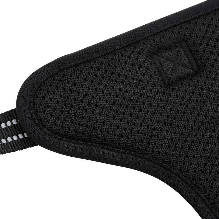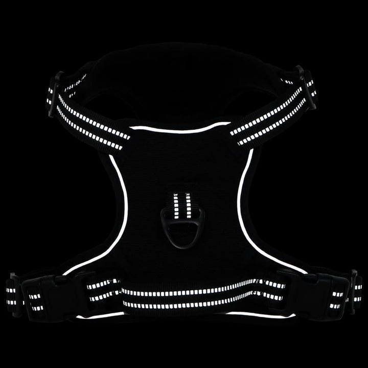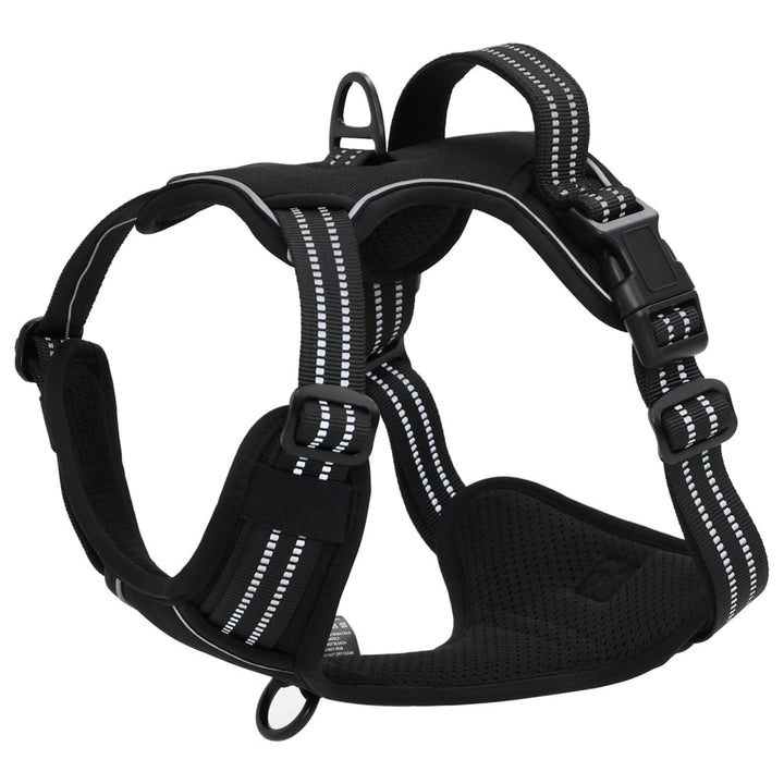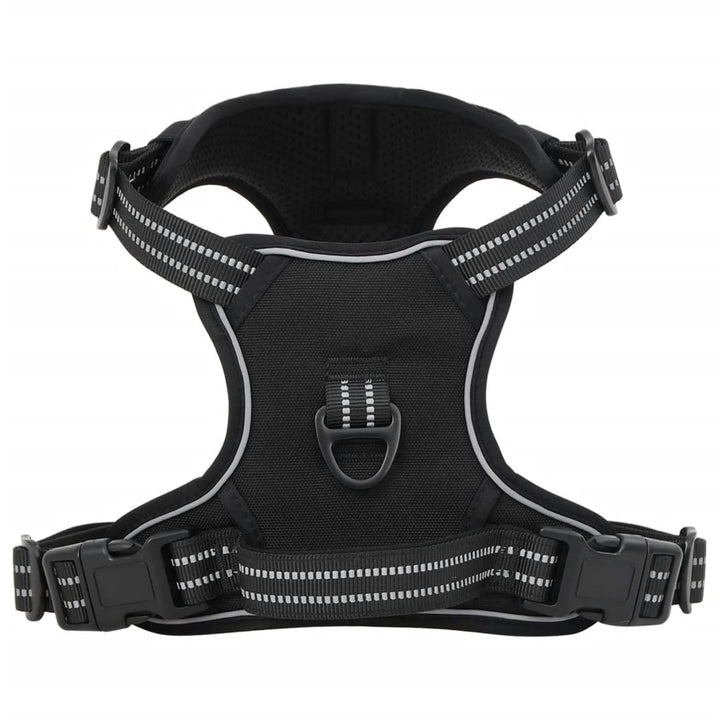 Say goodbye to pulling and hello to better control with our easy-to-use dog harness. Give your furry friend the best walking experience! Easy to put on and take off: This dog harness is easy to put on and take off with its 2 quick-release buckles. Simply slide the harness over your dog's head, fasten the buckles, adjust the straps, and you're good to go!Fully adjustable: This dog harness has 4 adjustable straps for a perfect fit. Customise the 2 neck and 2 chest straps for comfort and room to grow! Your dog will stay secure without slipping out or feeling choked, thanks to the even distribution of pulling force across their body.No Pull & No Choke: This dog harness has two leash rings for safer dog walks. Use the front clip to stop pulling during training, while the back ring is great for everyday walks, jogging, hiking, and more.Safe and comfortable: This dog harness is made of polyester and padded with a soft cushion to protect your dog's skin. Also, the breathable air mesh keeps your dog cool and comfy all day.Reflective strips for high visibility: This dog harness features reflective strips on its surface, ensuring a safe walk both day and night. Good to know:This product is suitable for machine and hand washing, for best results and to extend its lifespan, hand washing is recommended.
